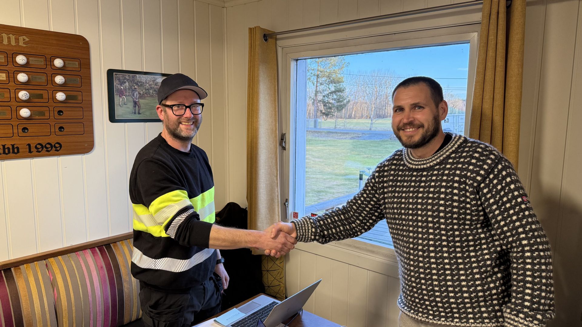 På bildet ser vi vår tidligere greenkeeper, Hristo Iliev (til høyre), gi over ansvaret for 9-hullsbanen til Espen.
